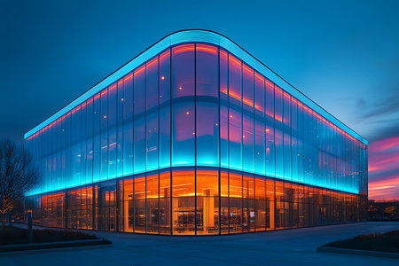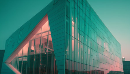 This striking building features sharp angles and large glass panels, illuminated by gentle daylight for a futuristic feel