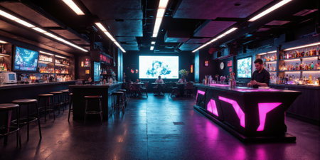 A dynamic gaming arena featuring vibrant neon lights and modern design elements, ideal for hosting competitive gaming events and esports tournaments.