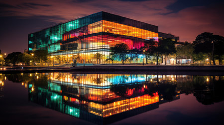 Modern office building at night with reflection on glass facade,