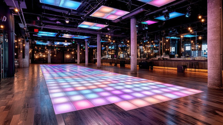 A vibrant night club featuring spacious dance floor with colorful LED lights