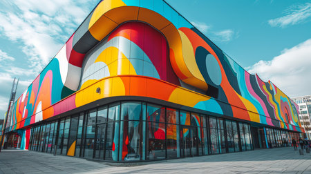 A vibrant, abstract mural covers the facade of a modern building, adding a splash of color to the urban environment.
