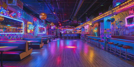 Colorful, empty arcade with neon lights and retro gaming machines