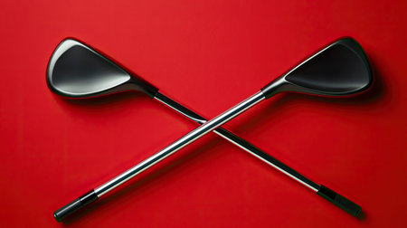 This striking image showcases two crossed golf clubs set against a vibrant red background, emphasizing the sport's tools and dynamic energy. Perfect for articles or promotions about golf.