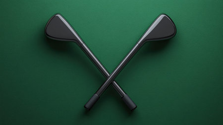 This image features two black golf clubs crossed on a vibrant green background, symbolizing sport, competition, and leisure activities. Ideal for promotional or editorial use in sports contexts.