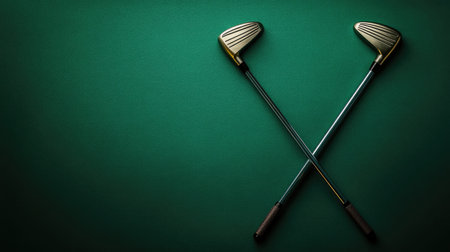 A pair of golf clubs crossed elegantly against a vibrant green background, symbolizing sport and leisure, perfect for design and promotional use.