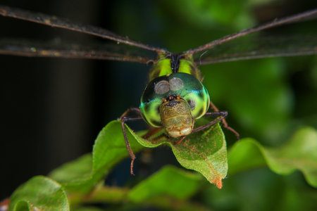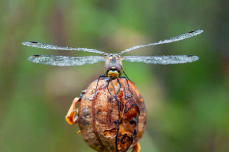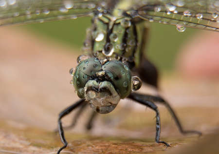 Macro shots, showing of eyes dragonfly and wings detail. Beautiful dragonfly in the nature habitat.