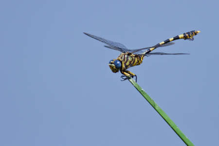 Macro of dragonfly sitting in reed stem blue sky