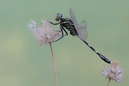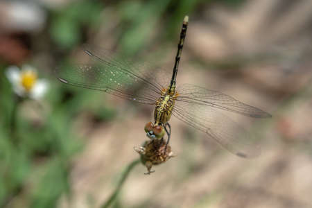 Dragonfly on a flower in the wild, closeup of photo