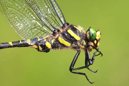 Sombre Goldenring dragonfly isolated on green.