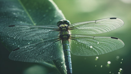 Vibrant dragonfly perching on a wet green leaf in spring time generated by artificial intelligence