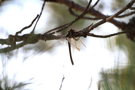 Close up a Dragonfly on a branch. Life, detail.