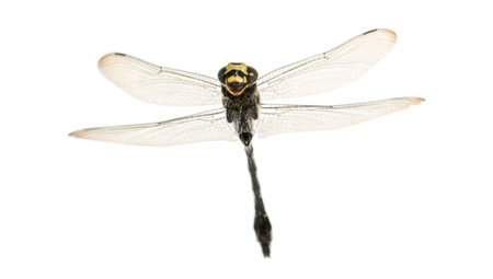 Macro shot of a dragonfly on a white background. Close-up