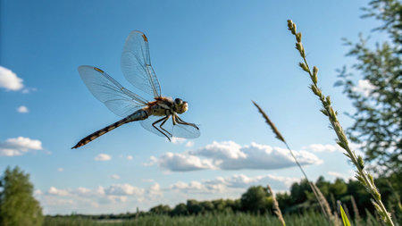 Dragonfly in flight on a background of blue sky and grass.