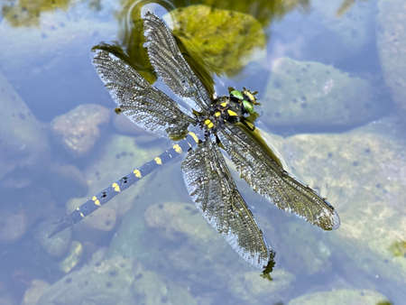 Dragonfly caught on branches dead on water in sun shine morning