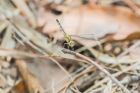 Close up of Dragonfly perched on a tree branch, dry wood and nature background, Selective focus, Colorful insect in Thailand.