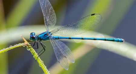 A macro perspective of a dragonfly perched on a twig, with its wings shimmering in the sunlight, showcasing the elegance of this flying insect.