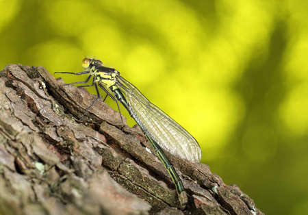 dragonfly insect on pine bark and colored background