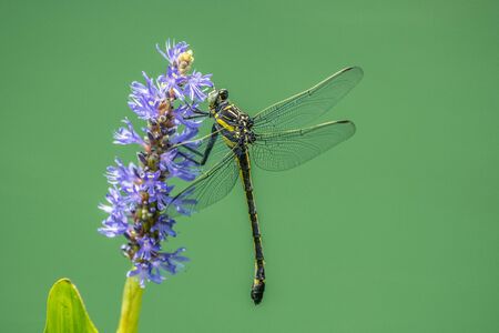 Dragonfly Gomphus vulgatissimus in front of green background macro shot with dew. on the wings. Blue flowers in the morning of a sunny summer day.