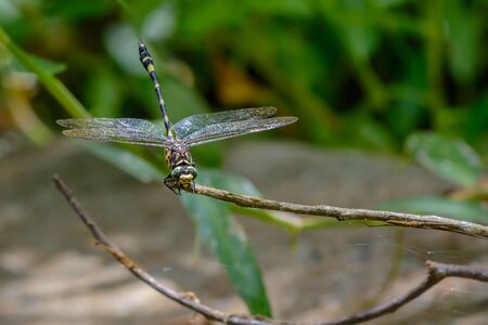 A Common flangetail dragonfly, Ictinogomphus decorates, on a branch.