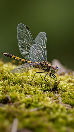 A vibrant green dragonfly stands on a mossy ground showing its intricate wings and body. The scene captures a tranquil moment in nature on a sunny afternoon.