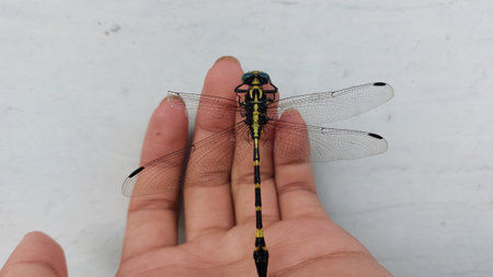 Young dragonfly kept on hand with two fingers close up