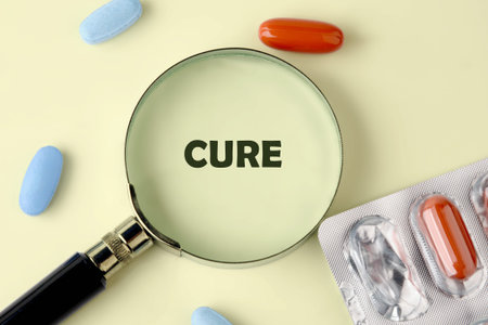 A magnifying glass highlights the word cure on a soft yellow surface, flanked by scattered blue oval tablets and vibrant orange capsules, some contained in their blister packaging.