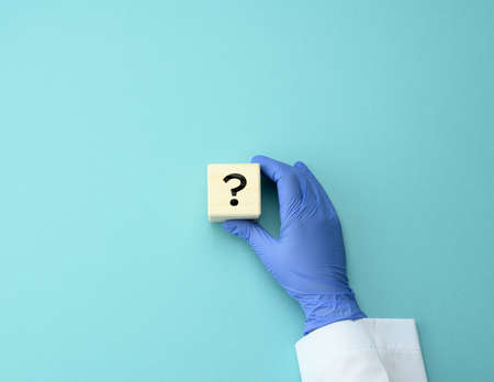 wooden cube with a question mark in the doctor's hand on a blue background. The concept of finding an answer to questions, treatment methods