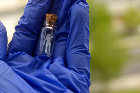 Covid-19, protection of vulnerable people against coronavirus, concept. Figure of a woman person inside a glass bottle on a hand with disposable glove.