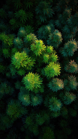 Aerial view of thriving cannabis marijuana plants, displaying rich green foliage and diverse leaf shapes, perfect for backgrounds in natural and botanical designs