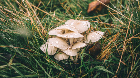 Cluster of mushrooms with droplets of water on their caps, surrounded by lush green grass. scene captures beauty of nature, showcasing delicate details of mushrooms and vibrant greenery