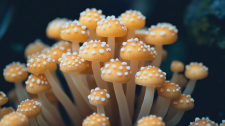 A detailed shot showcasing numerous tiny, bright orange mushrooms, each adorned with distinct white speckles on their caps, growing closely together.