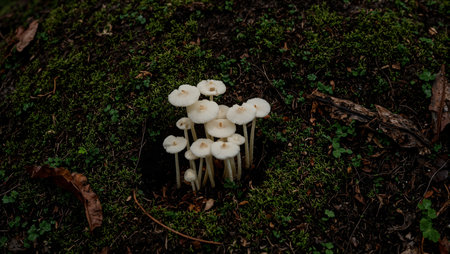Mushroom cluster thrives on forest floor in a lush woodland during daylight