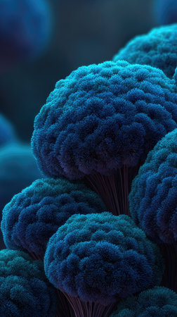 This image presents an abstract arrangement of multiple blue, textured shapes. The shapes have a sponge-like appearance and are set against a dark, undefined background. The lighting is soft and diffuse, creating shadows and depth. This visual could be useful in design projects or scientific visualizations.
