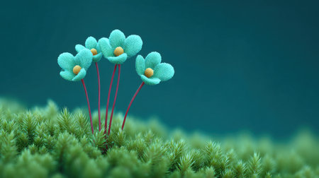 A close up of a field of green grass with four blue flowers in the foreground. The flowers are small and have a unique texture, giving them a whimsical appearance