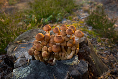 Autumn mushrooms. Picking mushrooms in the wild forest. Honey mushrooms on a stump in the forest. . A family of honey agarics. Close-up horizontal photography.