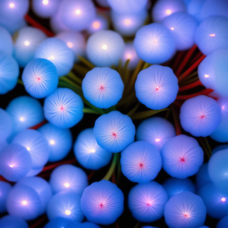 This stunning close-up captures vibrant purple flower buds adorned with tiny golden particles, showcasing intricate details against a contrasting dark background.