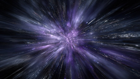 This abstract image features a central burst of purple light emanating outwards against a dark background. The composition employs a radial design with linear elements, creating a sense of movement. Suitable for various applications, this image provides a visually striking element. It can be used for design projects and visual content.