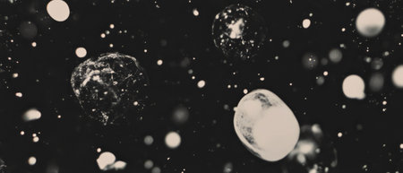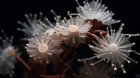 a close-up portrait photograph showcasing the intricate details of unknown escherichia coli biological virus alien flowers. the image captures the brittle yet beautiful essence of these flowers, with dry and elegant petals. the rich and vivid contrast, along with the depth of field and black tones, creates a crisp and realistic depiction. shot on a 100mm lens with an aperture of f/2.0, the natural lighting