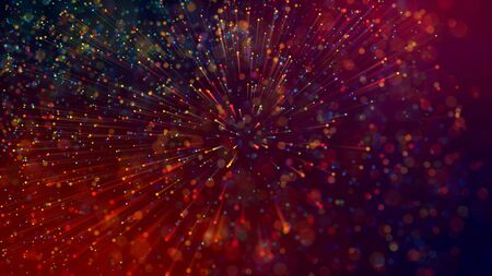 3d abstract beautiful background with colorful glowing particles, depth of field and bokeh effect. Abstract explosion of multicolored shiny particles or light rays like laser show.