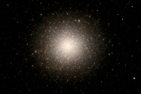 A dense star cluster glowing with thousands of stars packed tightly together, creating a luminous cosmic jewel.