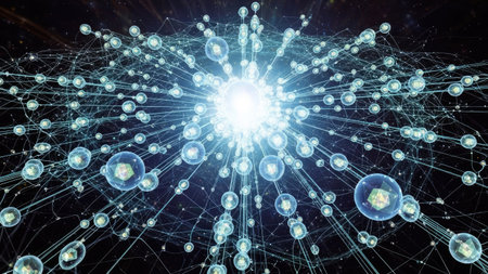 An artistic depiction presents a network structure, highlighted by a radiant central light source. The illustration features interconnected nodes and lines, utilizing cool blue tones against a dark background. This style could be used for conceptual visualizations regarding information, technology, or scientific concepts, suitable for diverse editorial or commercial applications.