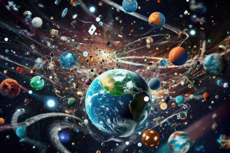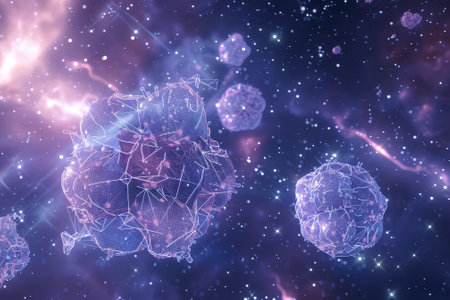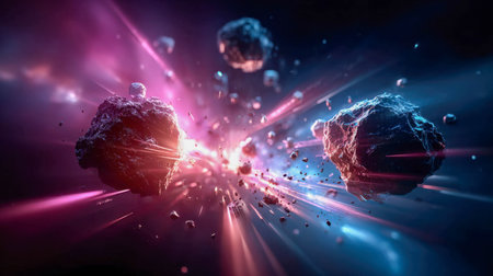 Abstract cosmic scene with glowing asteroids and colorful explosion in deep outer space.