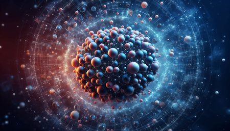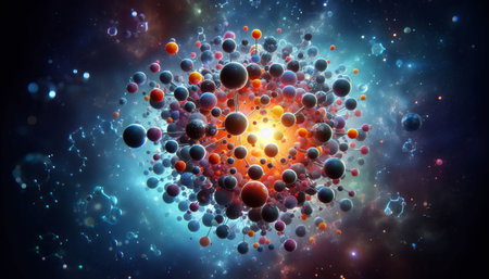 A cluster of small, colorful spheres floating in space. The spheres are connected by a network of lines, creating a sense of movement and energy. Scene is one of wonder and curiosity
