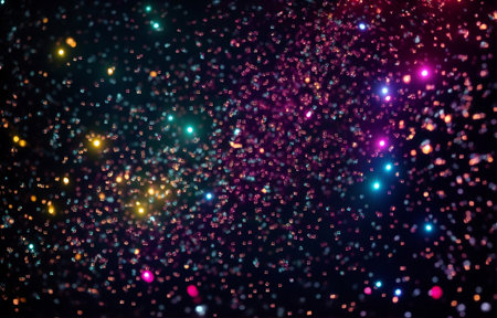 Colorful confetti particles floating in a dark background with shiny gold accents
