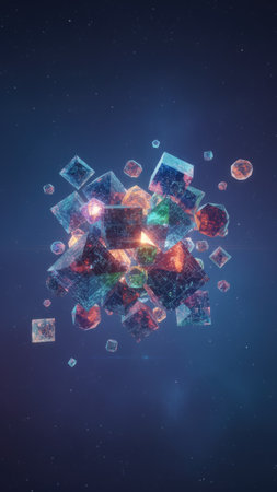 An artistic arrangement features translucent geometric shapes, including cubes and spheres, seemingly suspended in a deep blue space. The objects display internal color variations, with soft lighting effects adding depth and visual interest. This digital composition may be suitable for creative projects or visual design applications.
