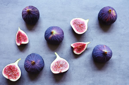 Fresh ripe figs on dark blue background. Top view.