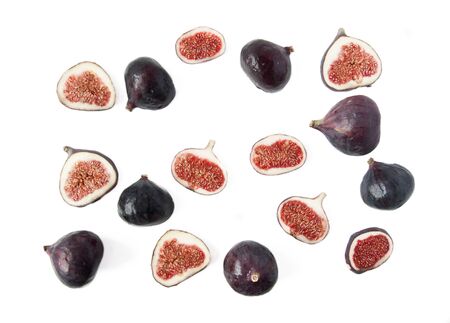 Pattern of sliced ripe figs isolated on white background. Fruit illustration. Food photo. Flat lay, Top view.