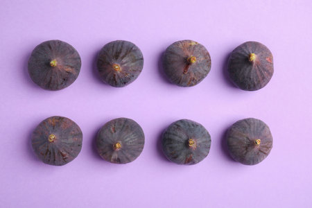 Delicious ripe figs on violet background, flat lay