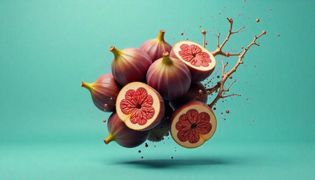 Fresh figs in artistic arrangement on teal background