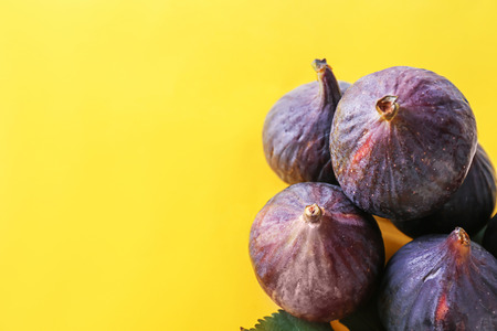 Fresh ripe purple figs on color background